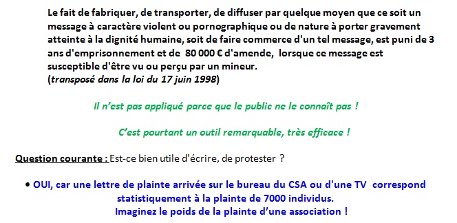 Madame Christine KELLY, une des 9 sages du CSA, interrogée à propos du laxisme de la signalétique actuelle qui avait présenté un -10 (fugitif) pour un téléfilm montrant la lente agonie d’un homme que l’on venait d’abattre, a répondu qu’on voyait pire sur Internet et que de toutes les façons, c’était une histoire d’éducation, qu’il incombait aux parents d’y veiller.( Europe1, le dimanche 11 juillet à 11h45)